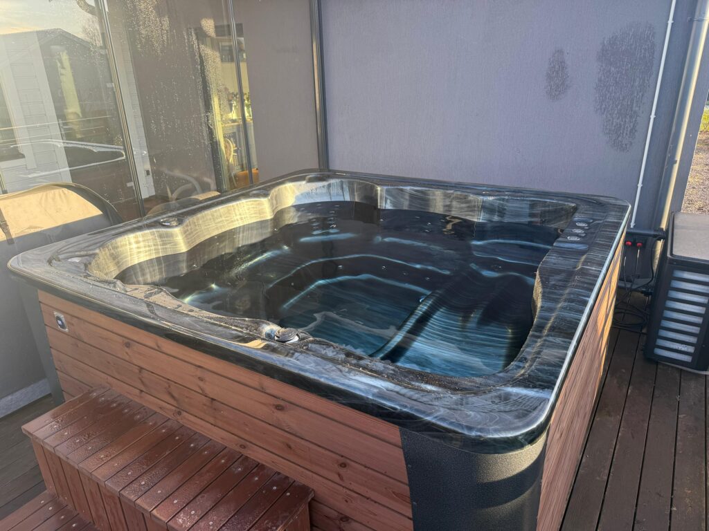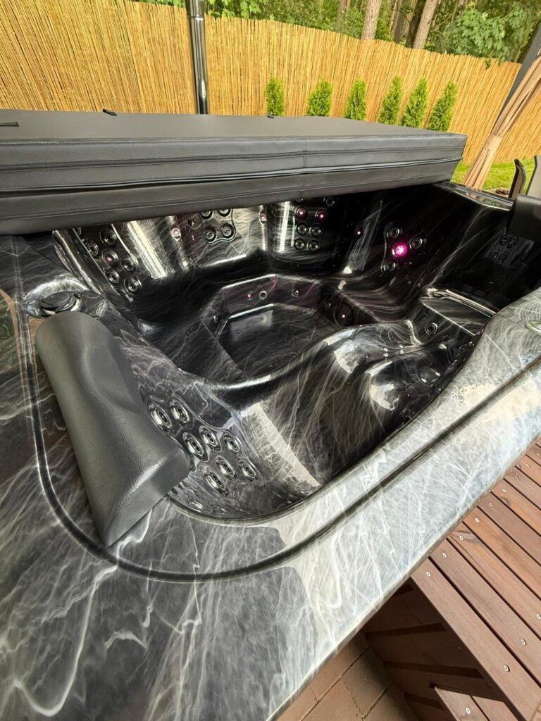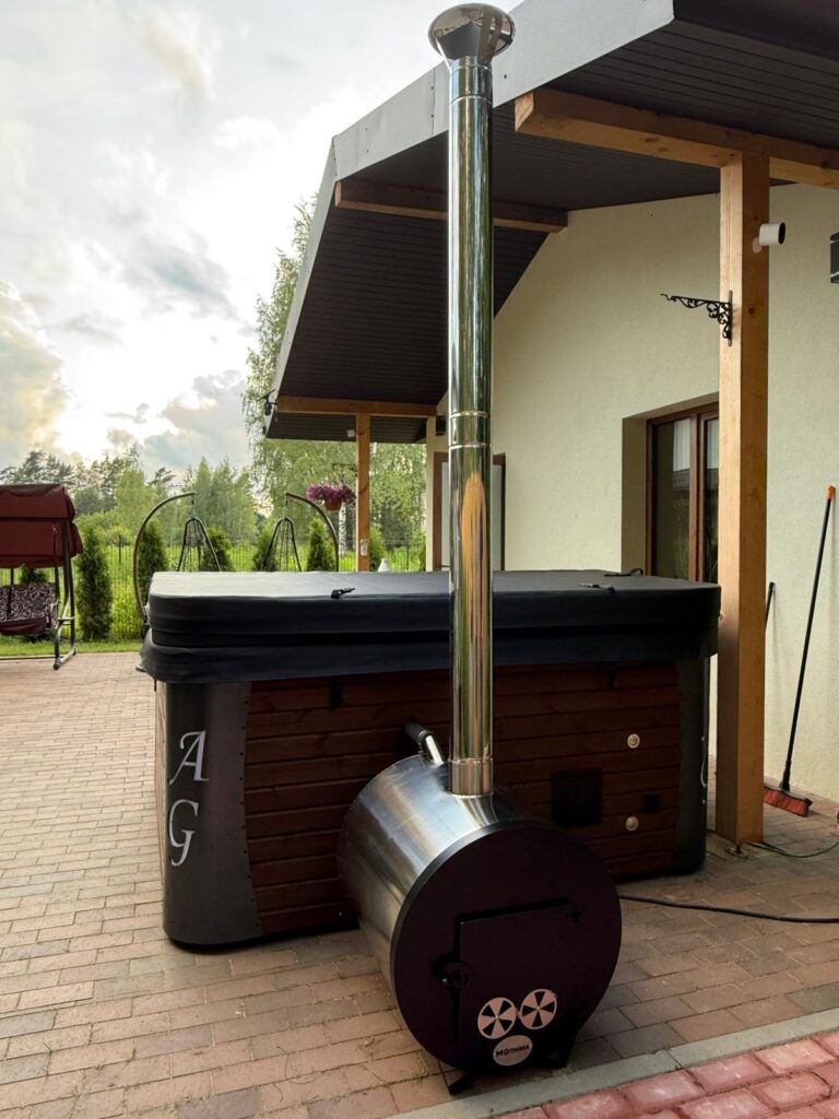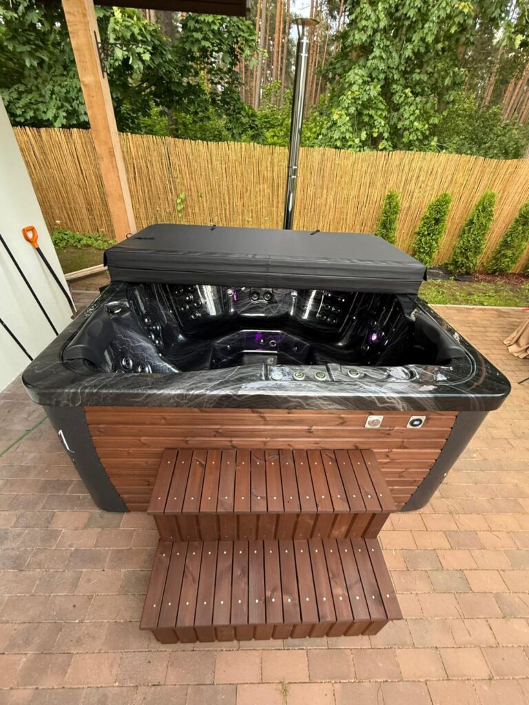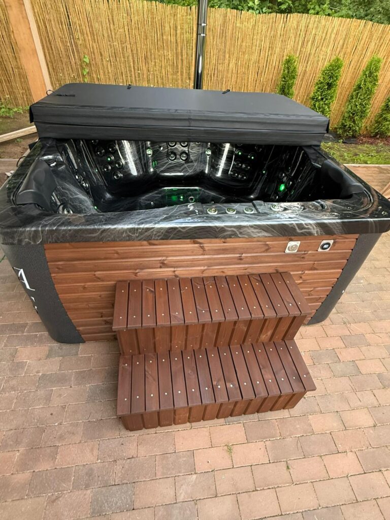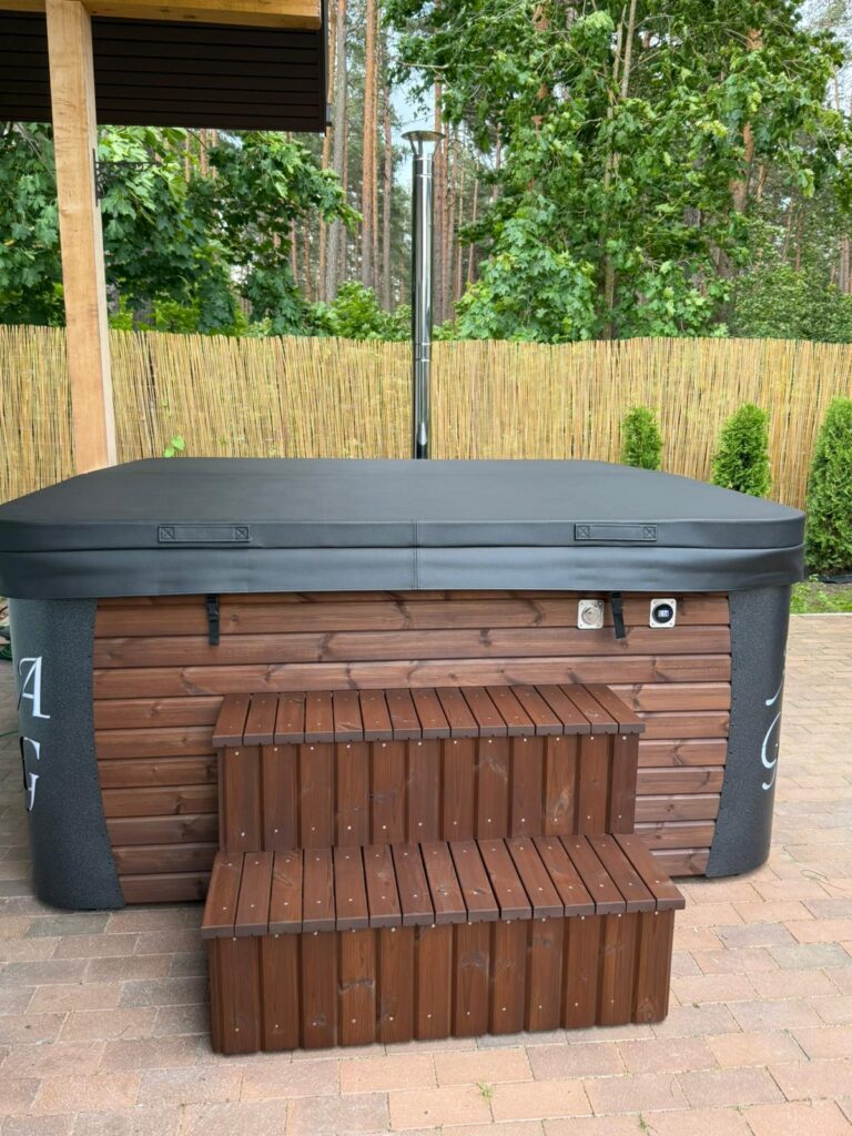 Acrylic hot tub with external stove, black marble acrylic basin, thermo-wood finish and insulated thermal cover.