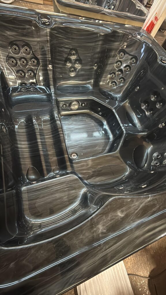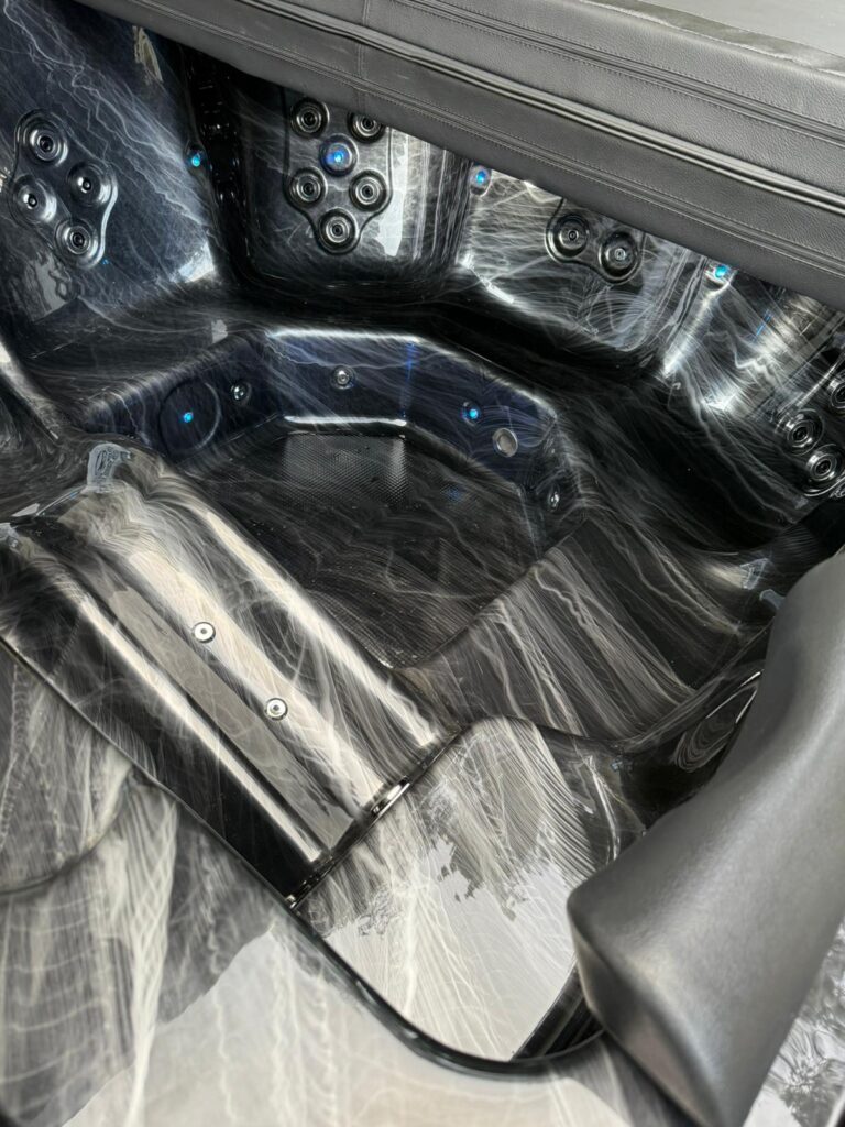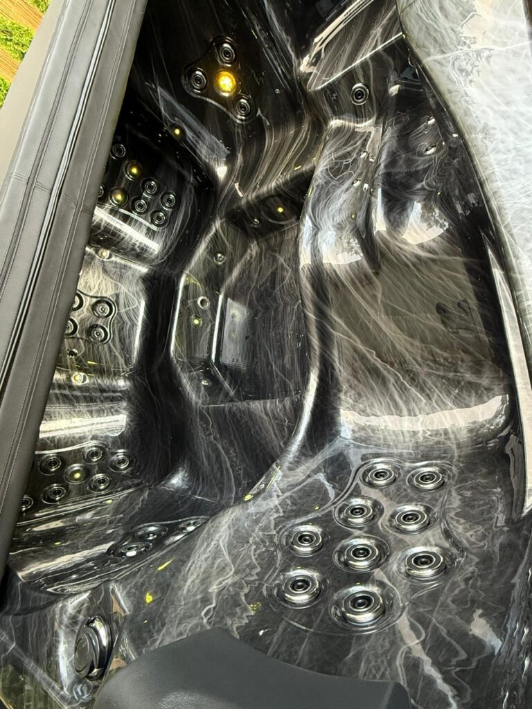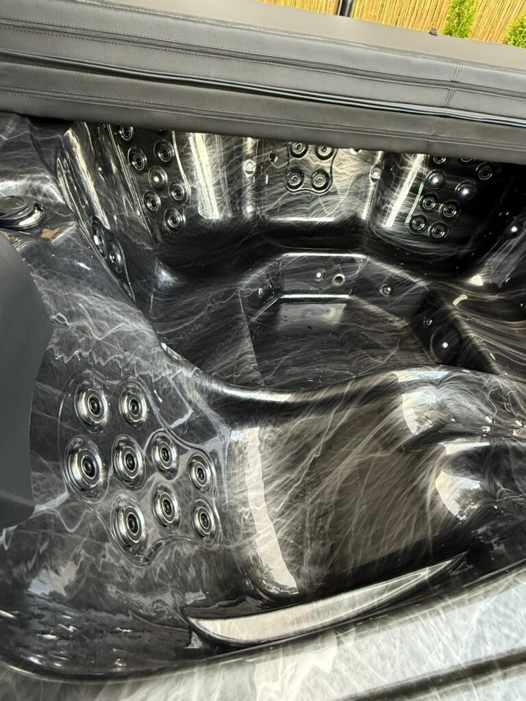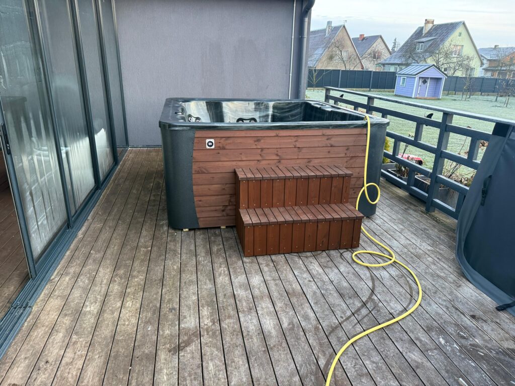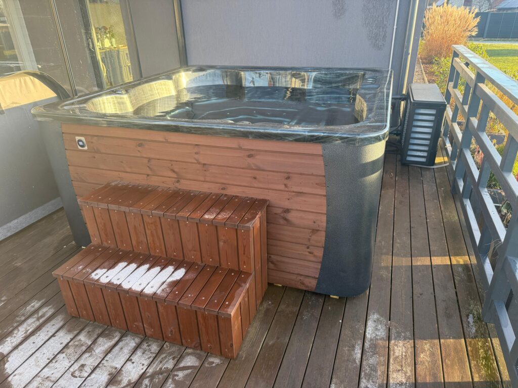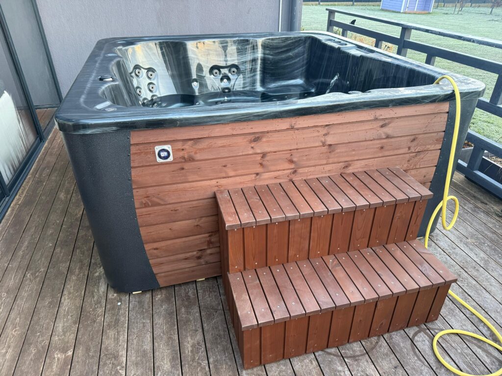 Acrylic hot tub with external stove, black marble acrylic basin, thermo-wood finish and insulated thermal cover.