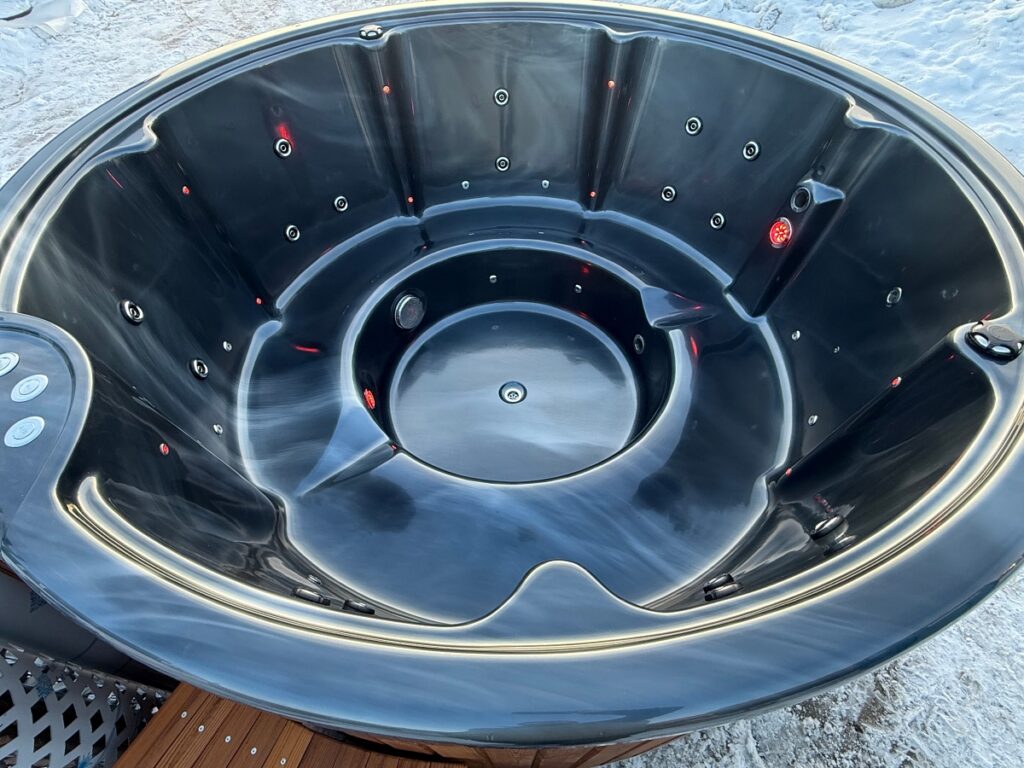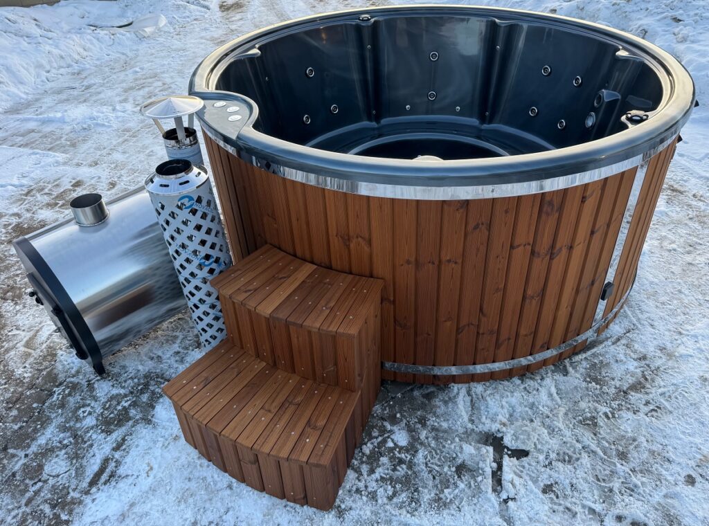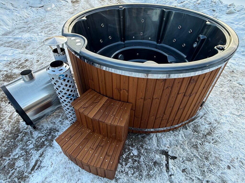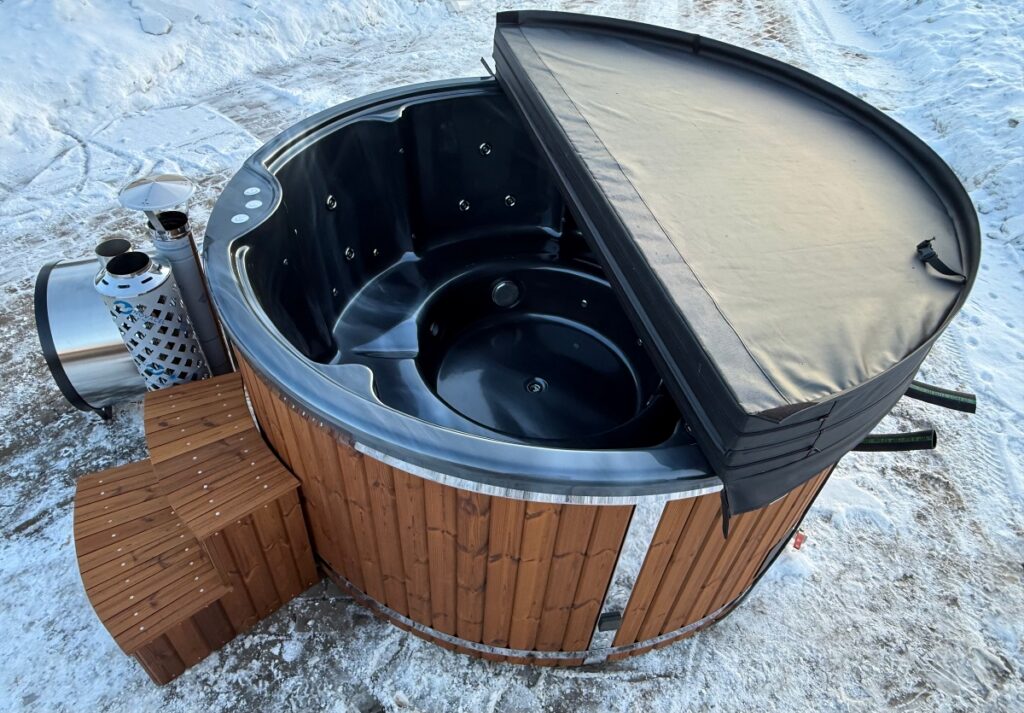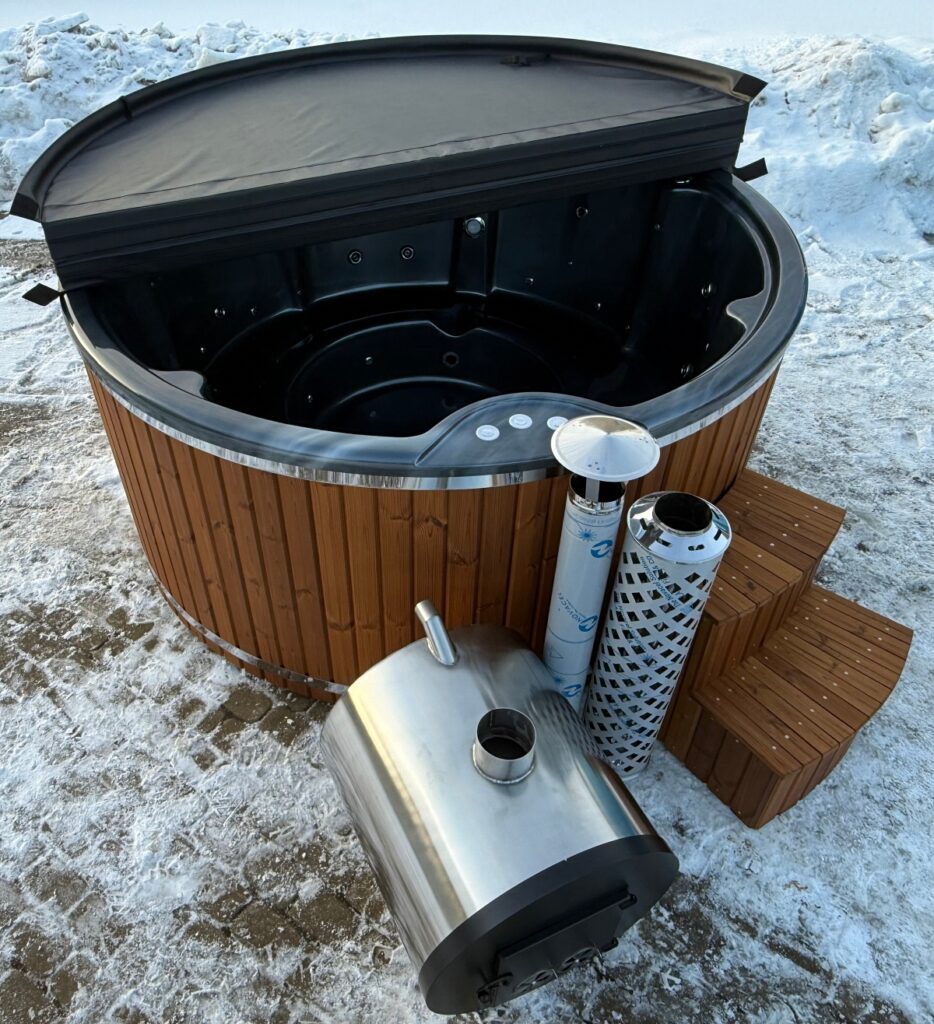 Acrylic hot tub with external stove, thermo-wood finish and insulated thermal cover.