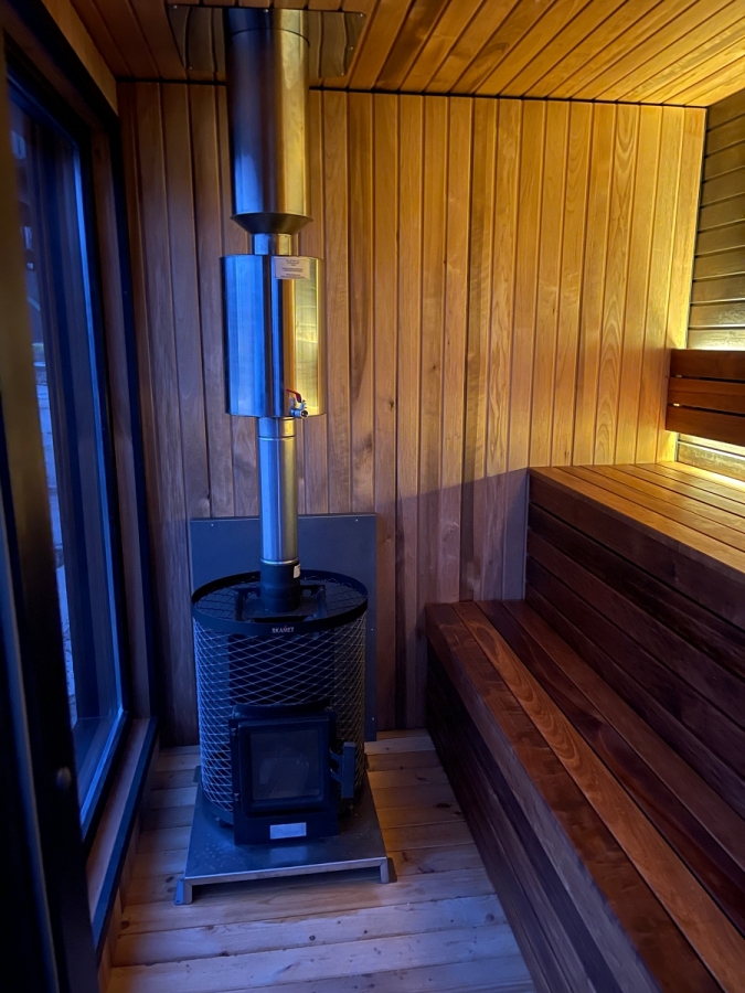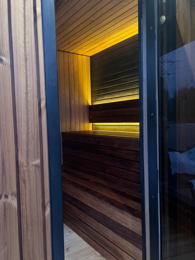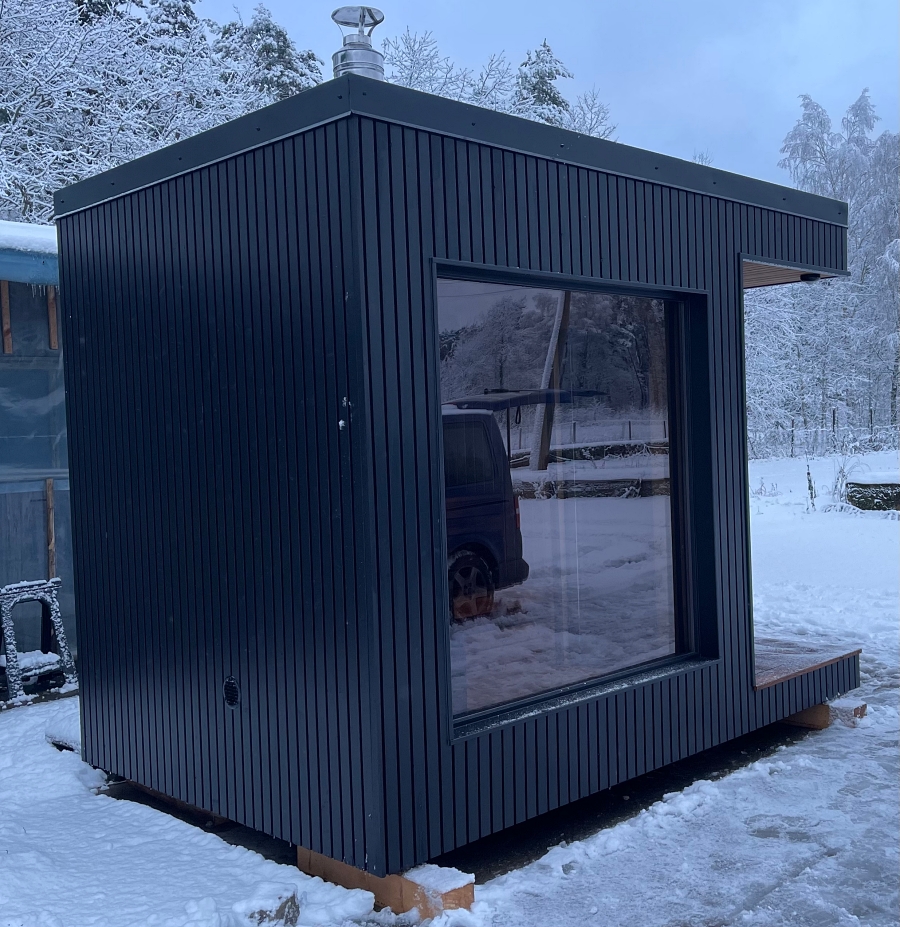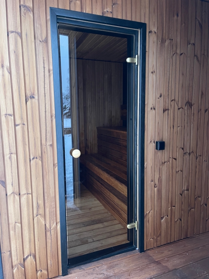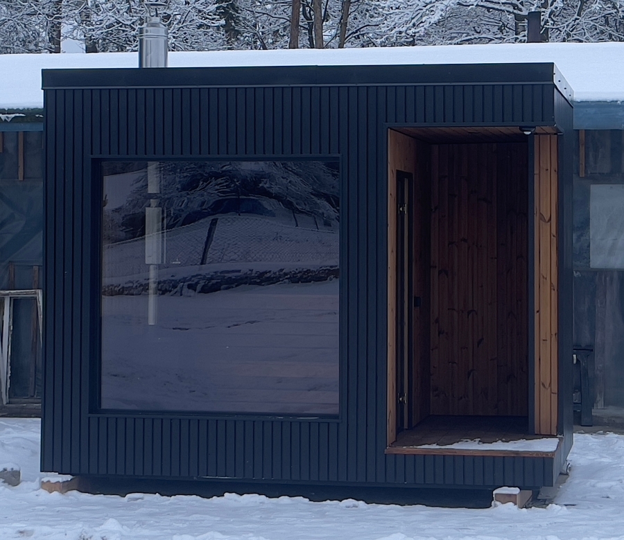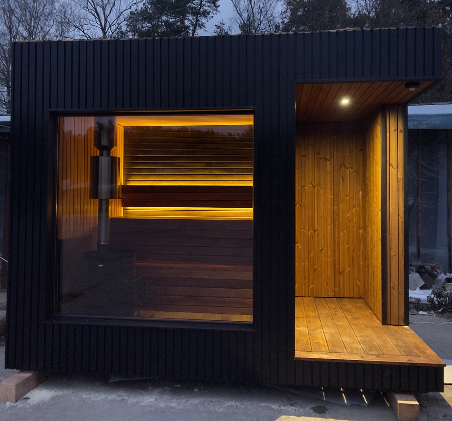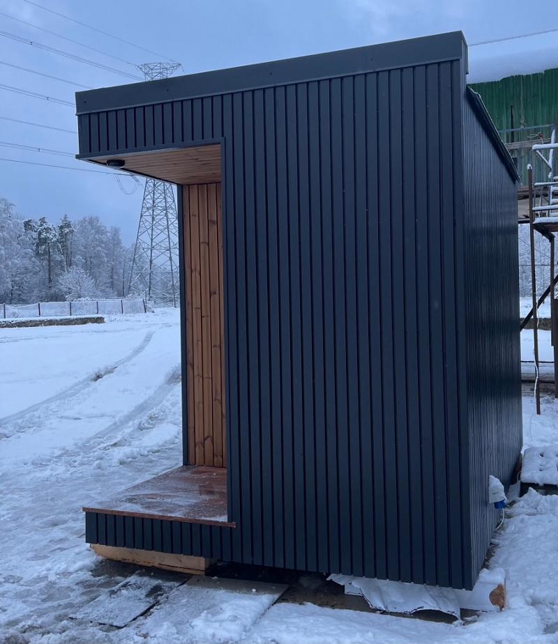 Wooden frame sauna 2.45 m x 3.6 m with an open-type vestibule. We offer the construction of all types of wooden frame sauna buildings, from the foundations to the key.