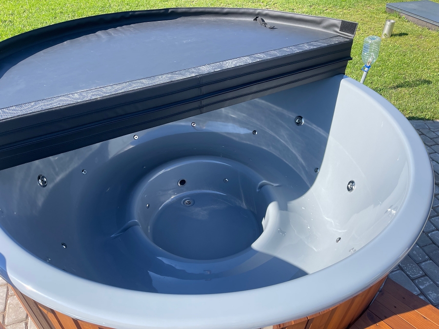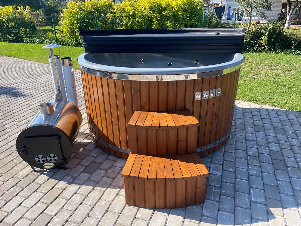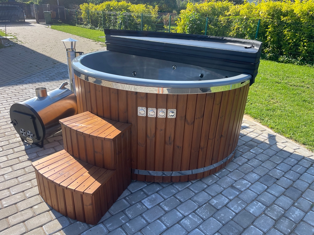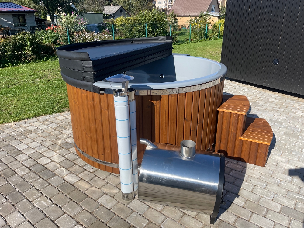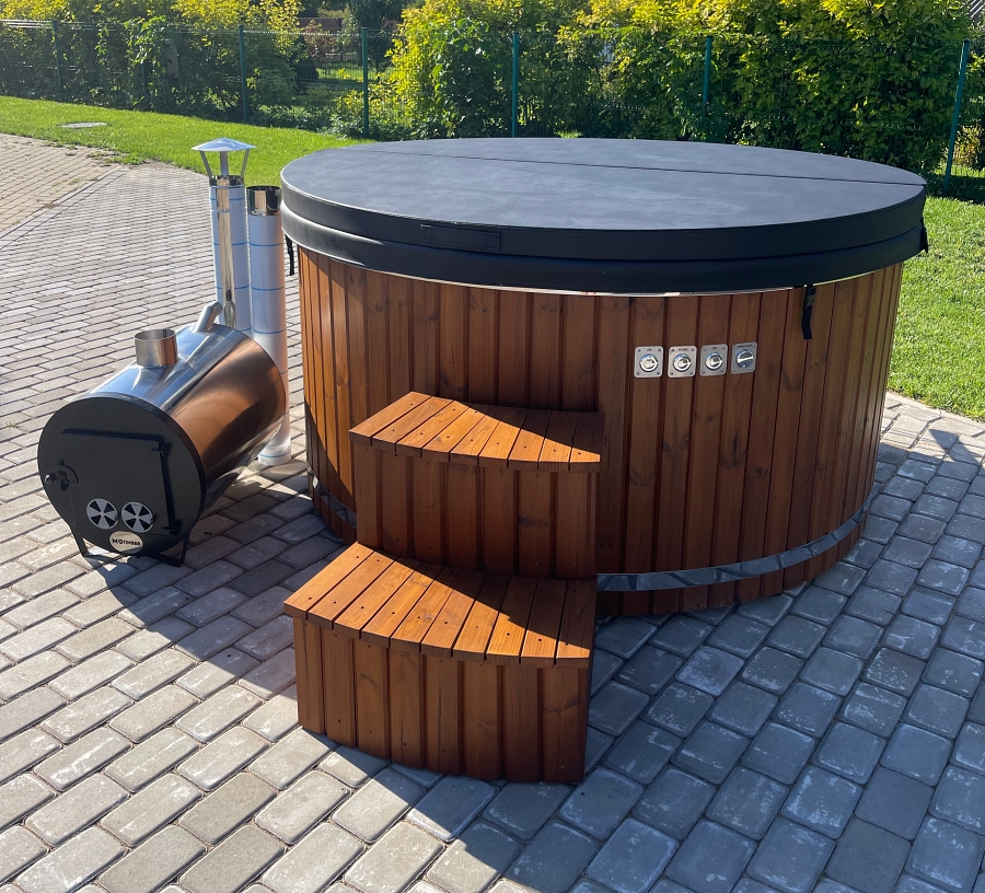 Fiberglass hot tub with external stove, thermowood finish and insulated thermal cover.