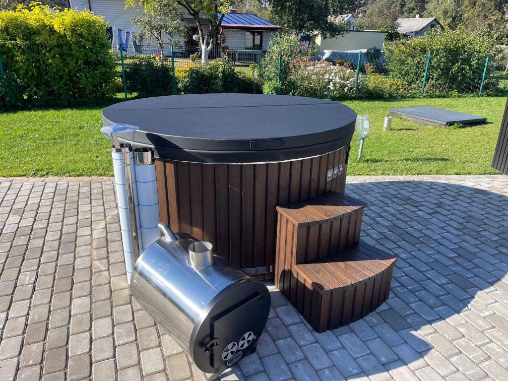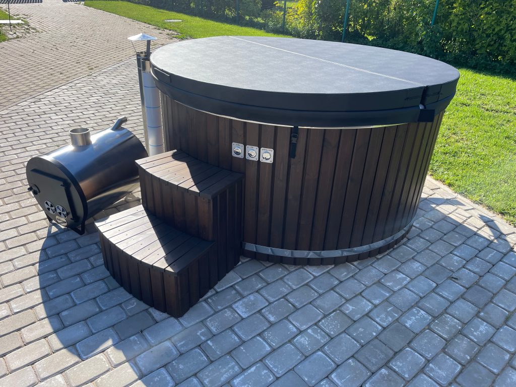 Fiberglass hot tub with external stove, thermowood finish and insulated thermowood cover.