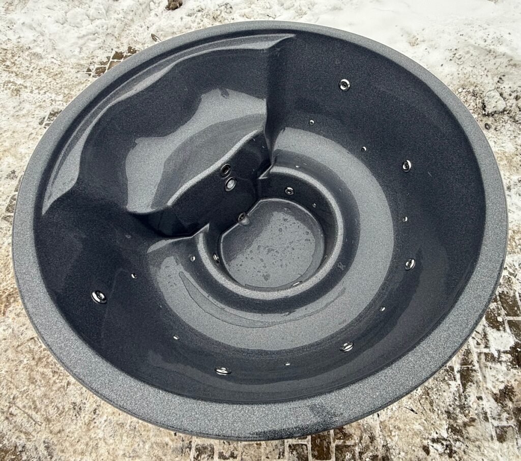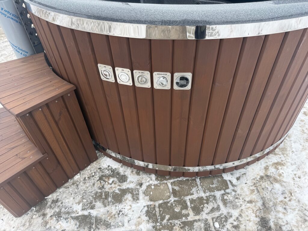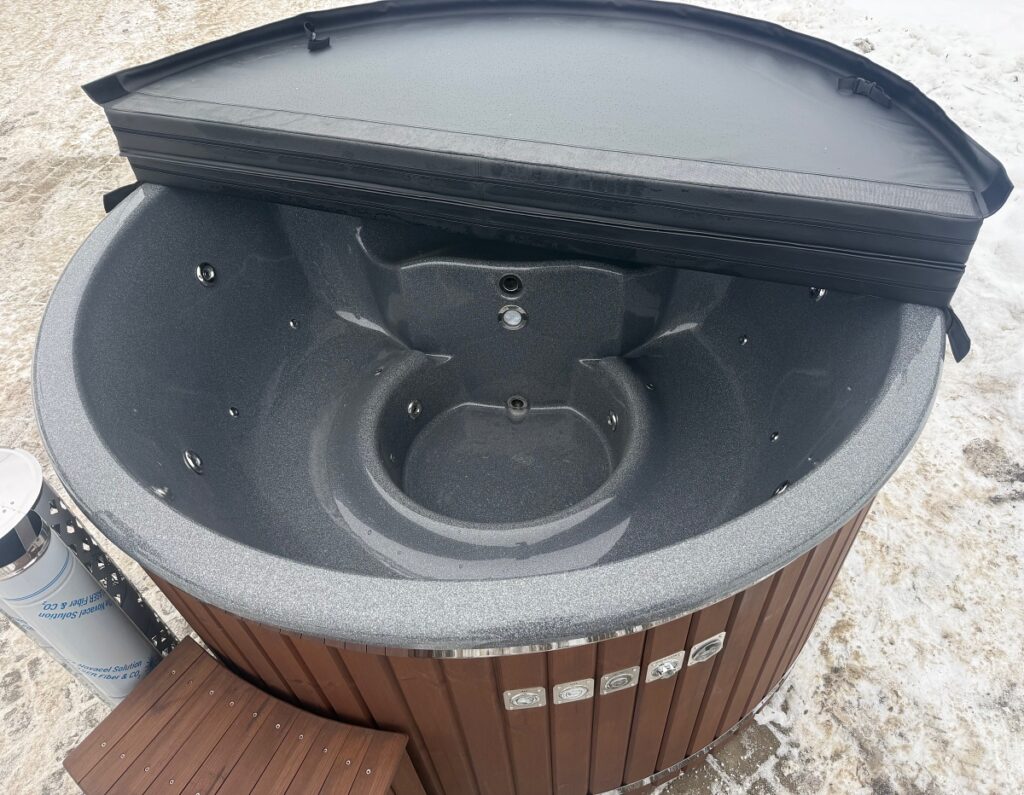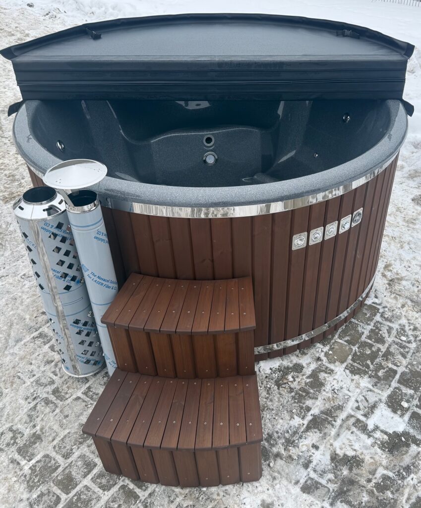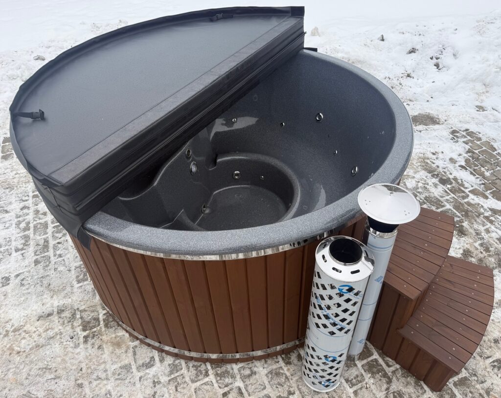 Fiberglass hot tub with dark gray granite-colored base, thermo-wood finish, integrated stove, equipped with both hydro-massage and air massage systems, and a thermal blanket for longer water temperature retention.