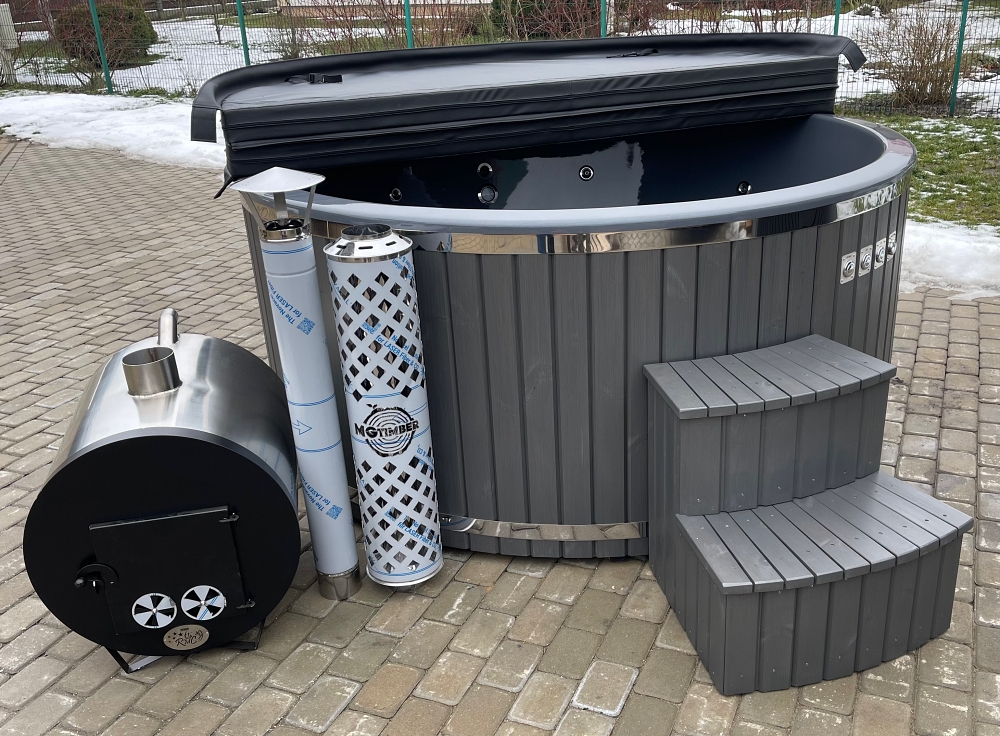 Fiberglass wooden hot tub with a large, dark gray pearlescent pool, thermowood finish, external stove, LED lighting, equipped with both hydromassage and air massage systems, and a thermal blanket for longer water temperature retention.