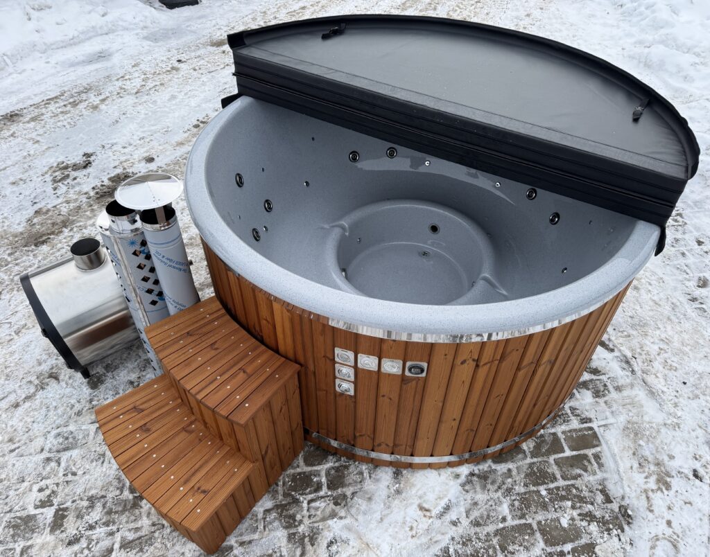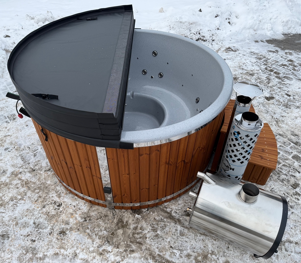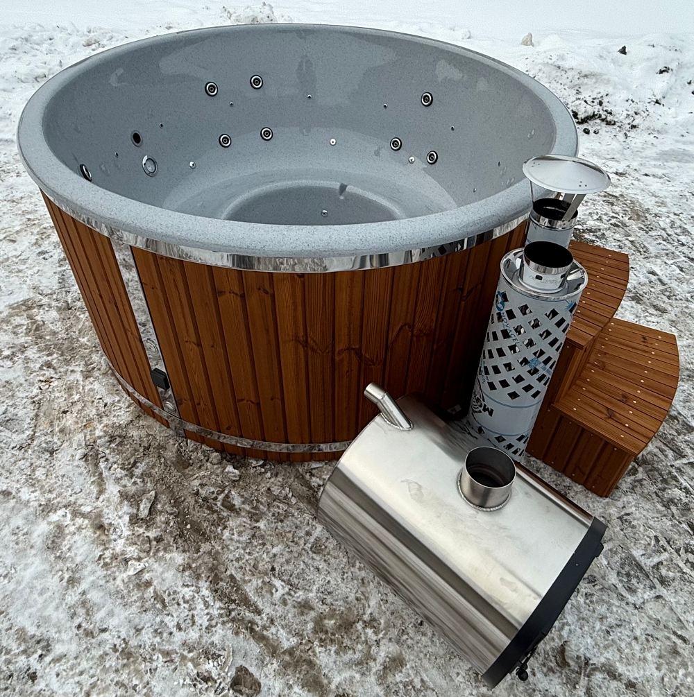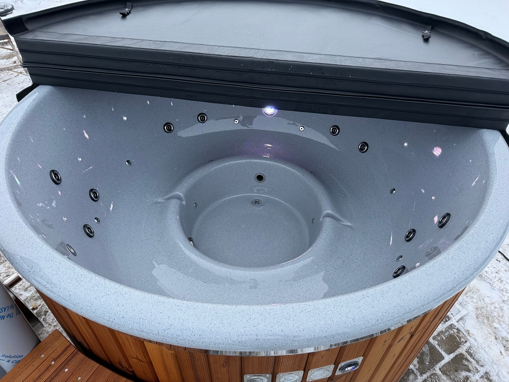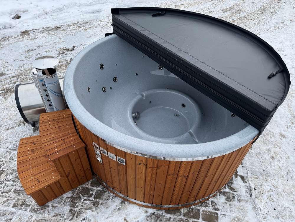 Fiberglass hot tub with external heater, fiberglass tub with granite effect, thermo-wood finish and insulated thermal cover. Hot tub with powerful hydro massage system, individual jet placement, possibility to connect an external filtration system.