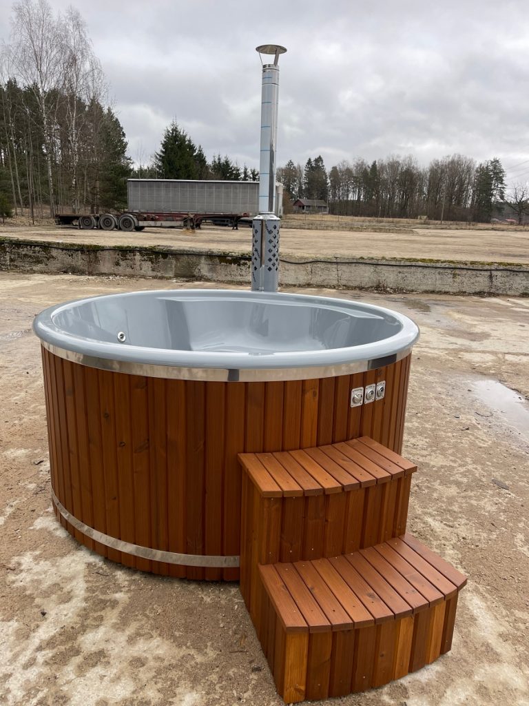 Fiberglass hot tub with integrated stove, thermowood finish and insulated thermal cover.
