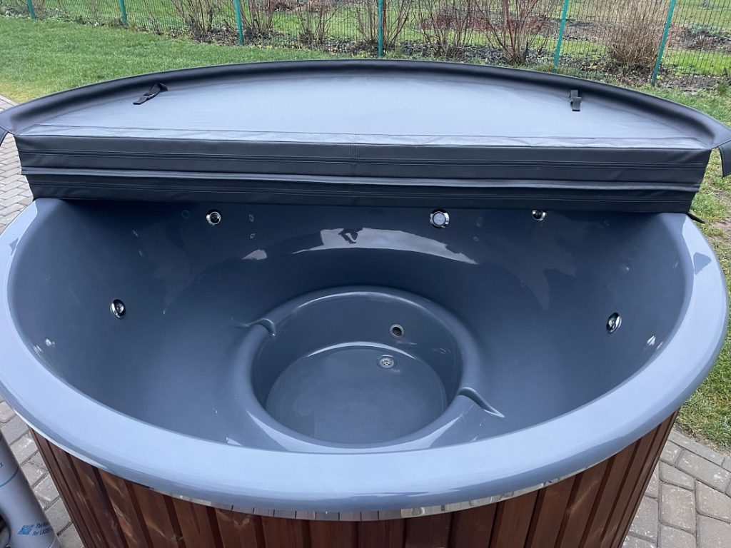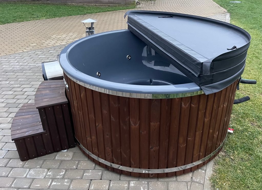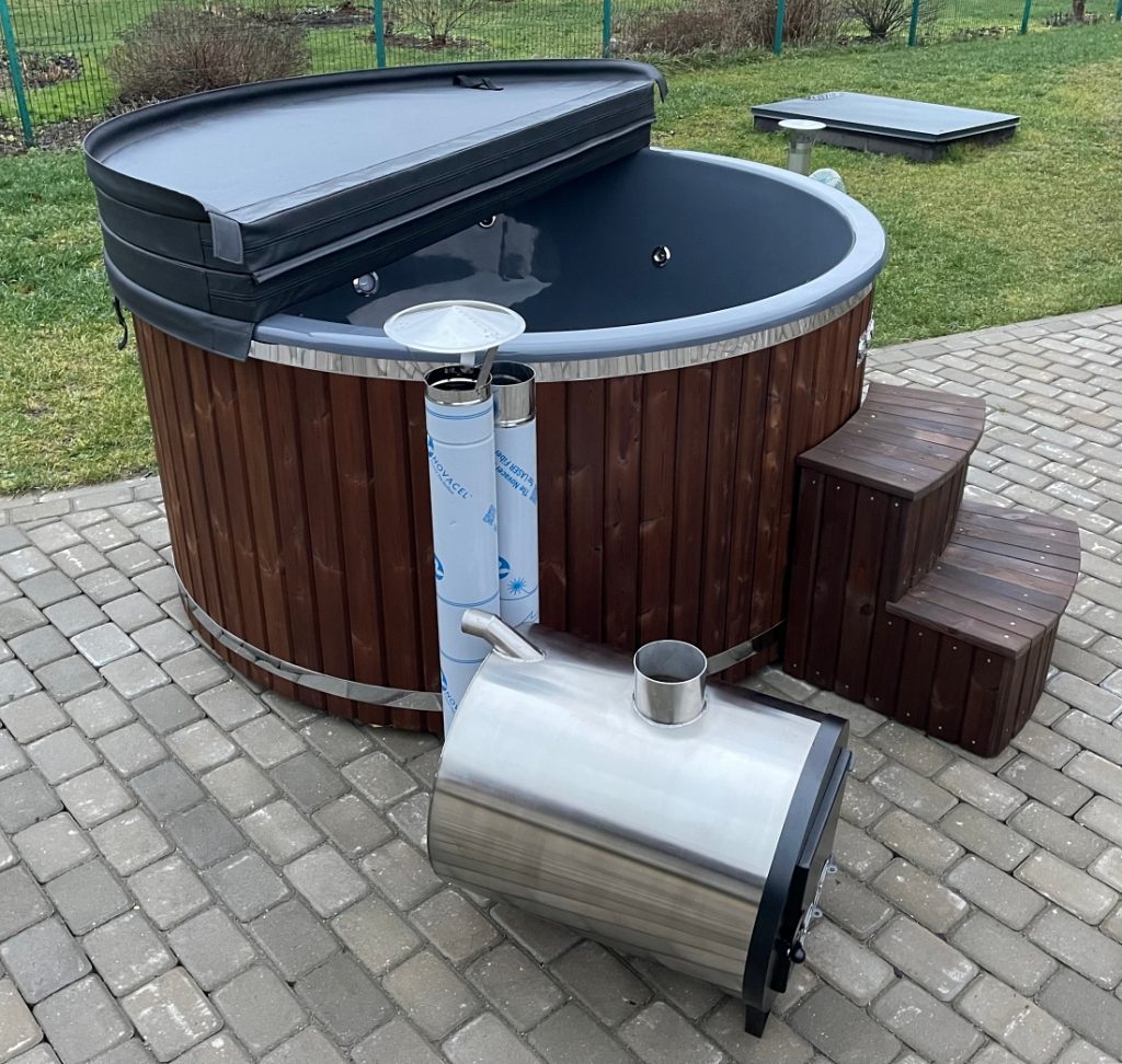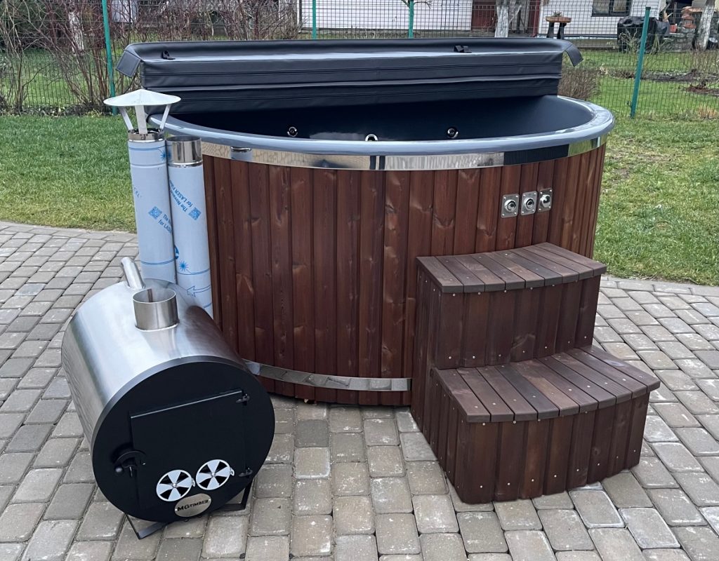 Hot tub with external stove, thermowood finish, equipped with 8-jet hydromassage.